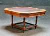 by "Morison and Co. Edinburgh", the moulded top with inset skiver, over panelled frieze on turned fluted legs united by stretchers, on ceramic castors