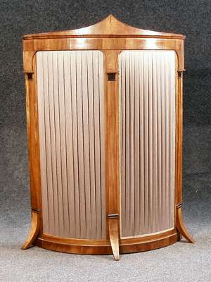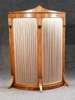 the peaked cornice over a plain frieze panel, with three column supports enclosing pleated screens, on downswept feet