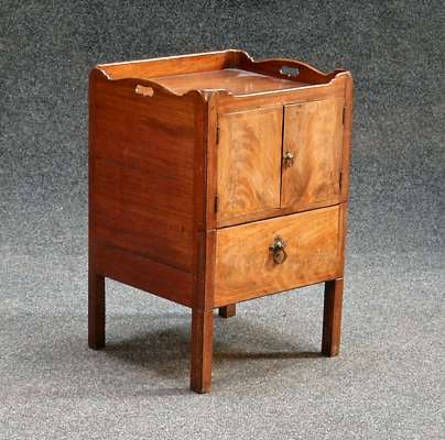 the serpentine gallery with pierced carrying handles above two cupboards over a fall flap, on square legs