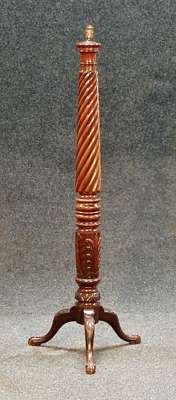 the spirally carved top over acanthus carved base on three foliate carved cabriole legs with claw and ball feet