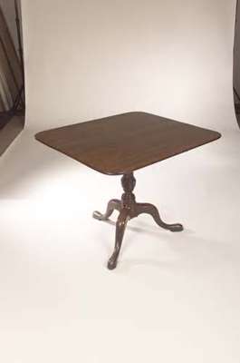 the rounded rectangular hinged top above a baluster column with spirally fluted knop on a tripod base with cabriole legs, terminating in pad feet