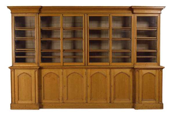 the projecting cornice above two pairs of sliding astragal glazed doors, flanked by two further astragal glazed doors enclosing adjustable shelves, the base with six doors, each with lancet arch panels, the whole raised on a plinth