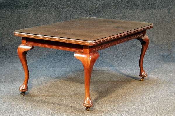 the moulded rectangular top over plain frieze on cabriole legs with pad feet and brass castors, including two additional leaves