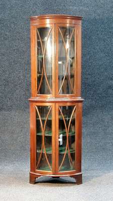the moulded dentil cornice over a plain frieze, with two astragal glazed doors enclosing shelves, on a stepped matching lower section with bracket feet