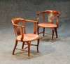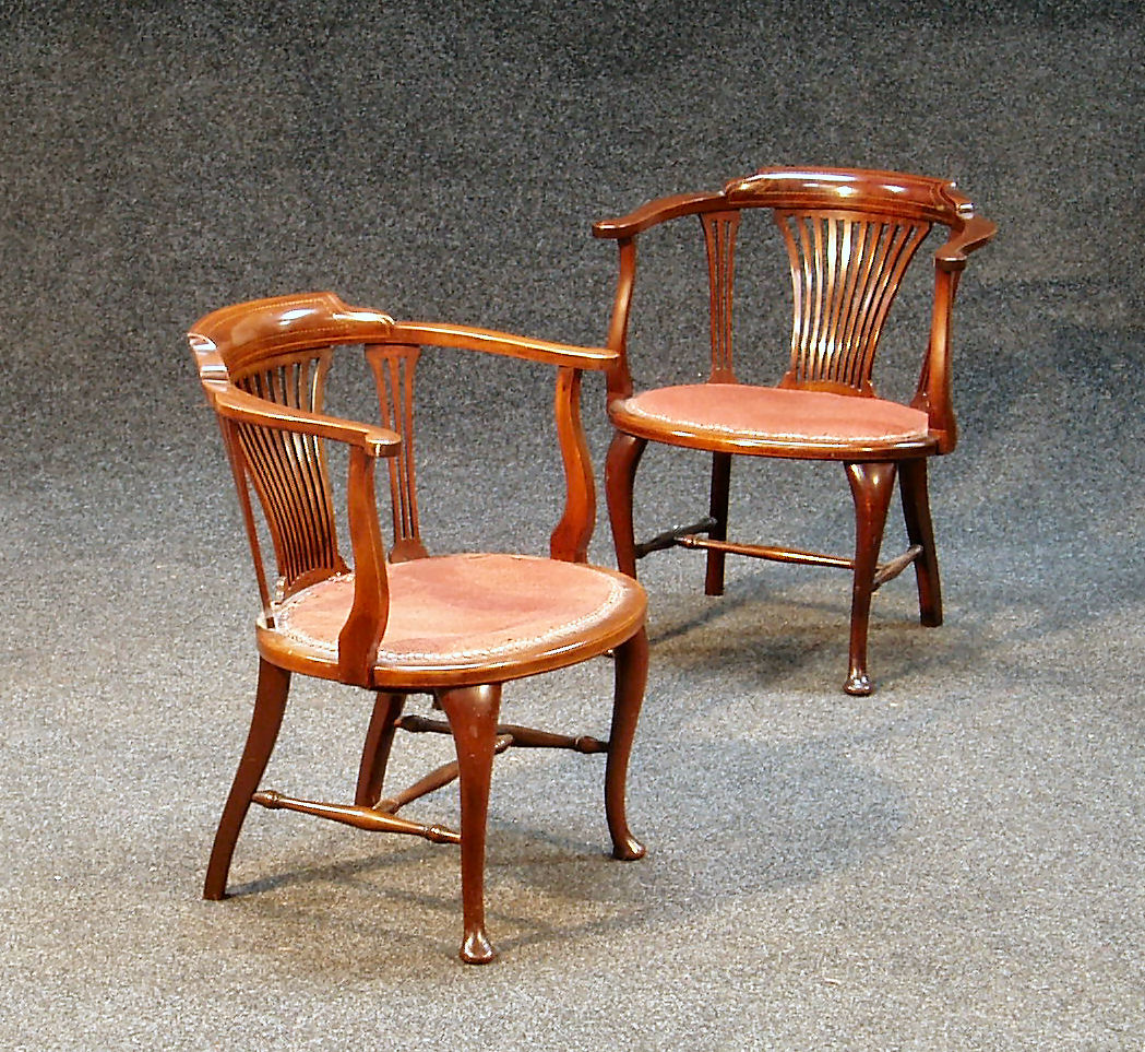 each with chequer-strung top-rail over vertical splats, above padded seat on cabriole legs, with pad feet united by turned stretchers (2)