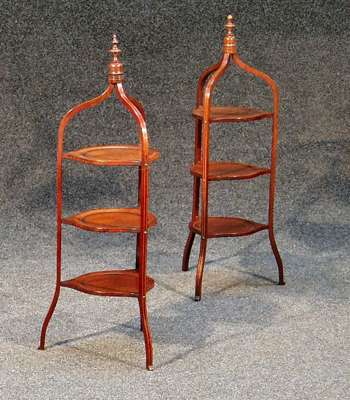 each with turned finial on boxwood strung tripod supports, united by three shelves (2)