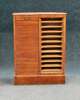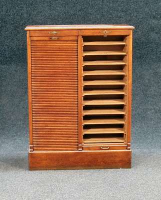 the moulded rectangular top above two tambour doors enclosing open drawers, on plinth base