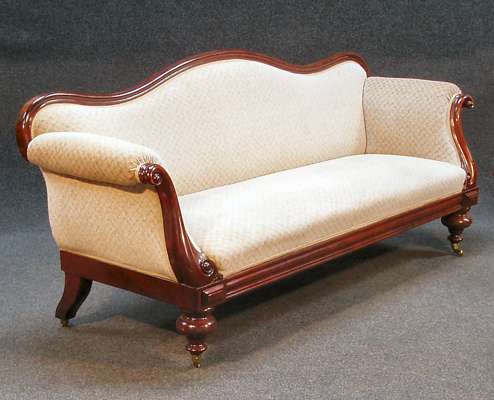 the moulded serpentine top rail over upholstered seat with moulded rail and outscrolling arms, on squat baluster turned legs, with brass caps and castors