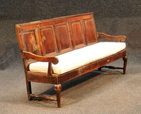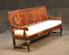 the moulded top rail over panelled back, out-stretched arms, on cabriole legs, united by block and turned stretchers