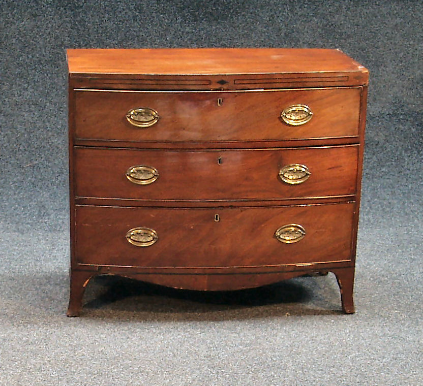 with ebony inlaid frieze panel over three graduated drawers,and serpentine apron on splayed feet