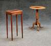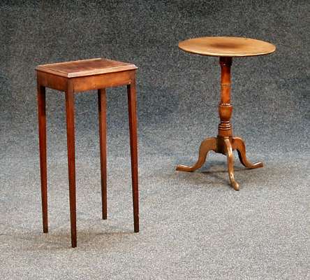the moulded top over a plain frieze drawer, on square tapering legs, 34cm wide; and a mahogany circular tripod table, with turned support above cabriole legs and pad feet, 49cm wide; together with a 19th century mahogany wall mirror, the rectangular glass plate with fretwork frame, 52cm high (3)