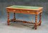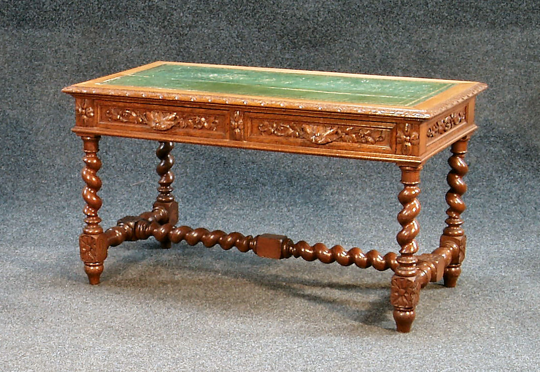 the rectangular top with screen tooled skiver over two carved frieze drawers on spirally turned legs, united by similar stretchers