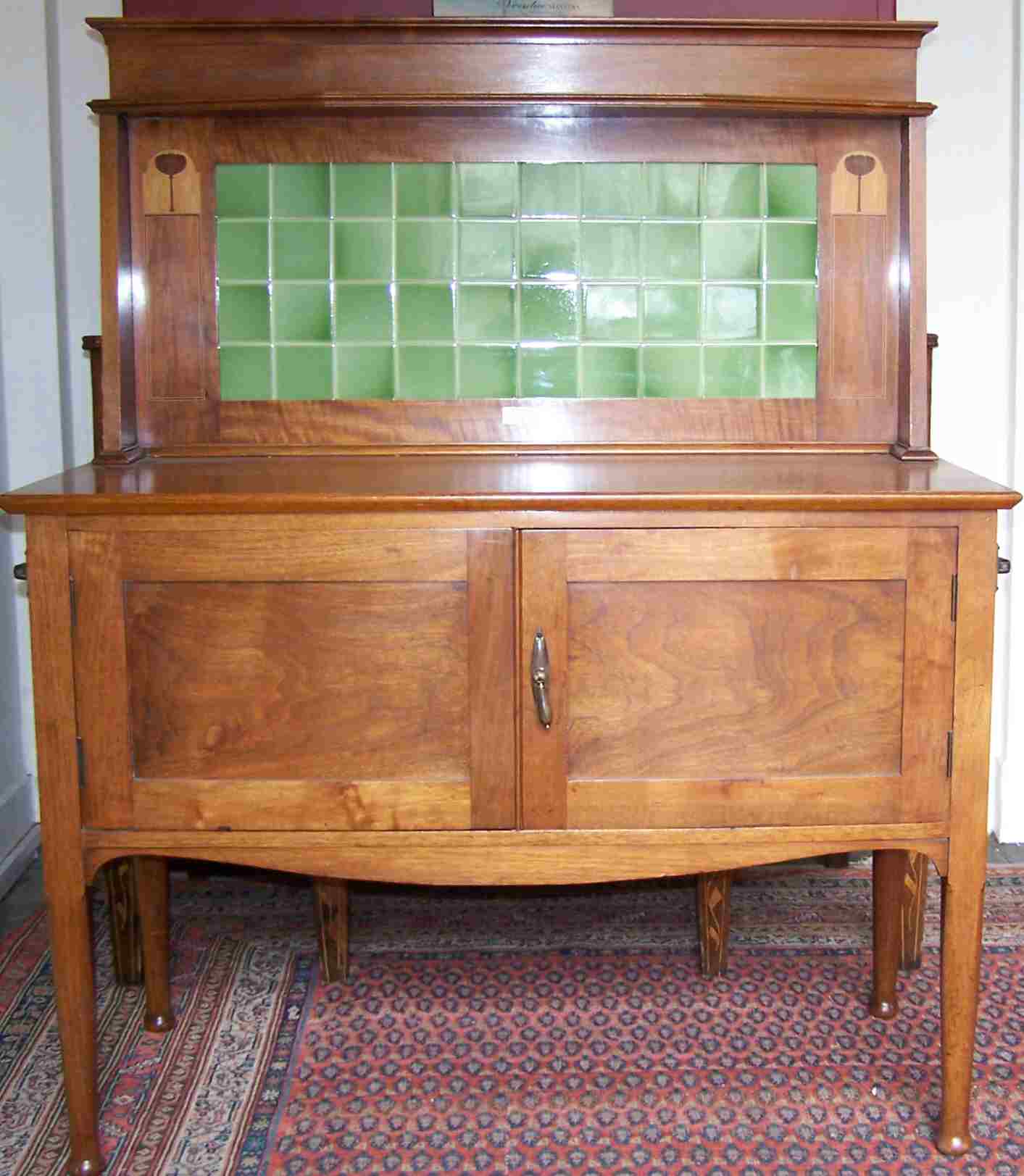 with tiled splashback, flanked by inlaid uprights, the rectangular top above two panelled doors on turned legs