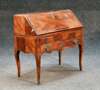 the quarter veneered serpentine fall-flap enclosing fitted interior, with two short over one long drawer, above shaped apron on cabriole legs and sabots