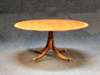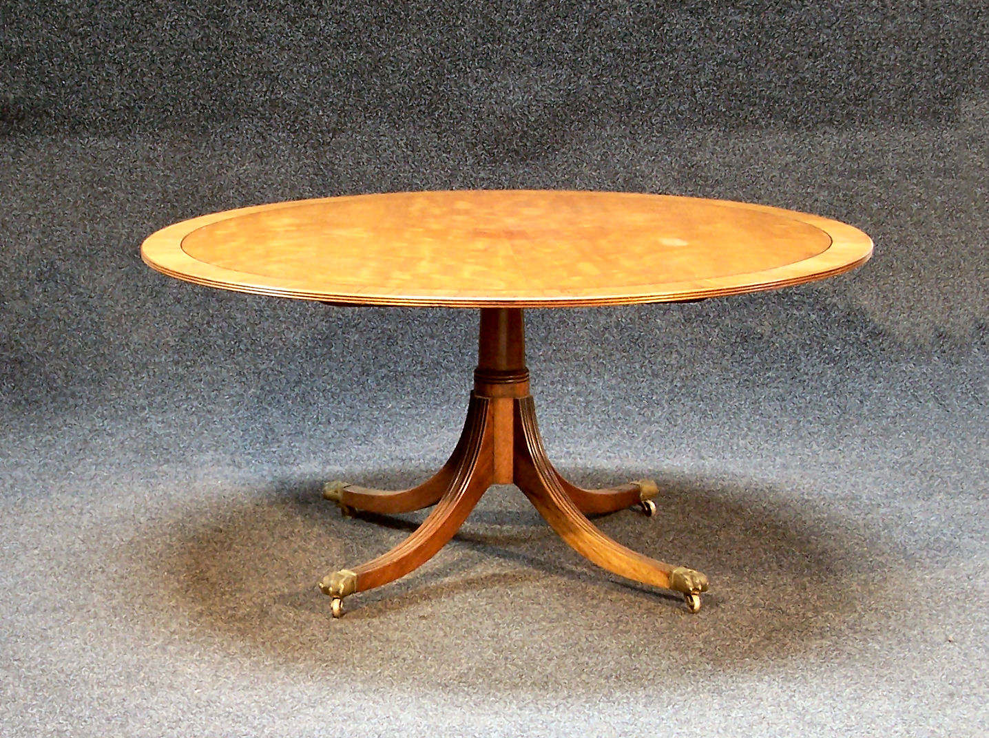 the moulded circular top on a tapering turned support, four reeded downswept legs with brass paw caps and castors