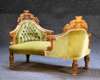 the opposing seats with moulded frame and an elaborate foliate carved heraldic crest over a button back and cushion on carved block and turned feet, brass castors