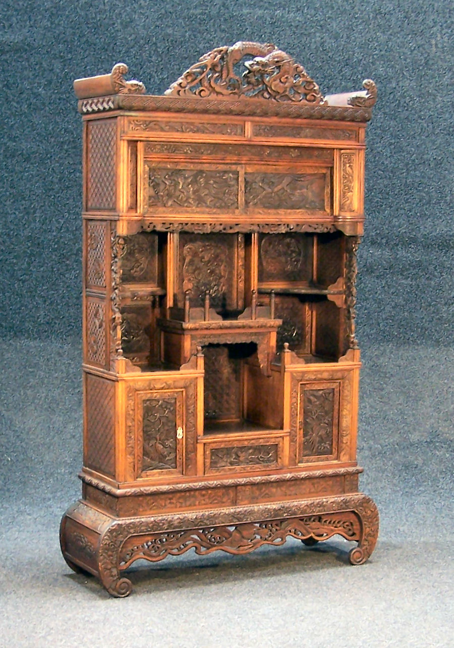 the elaborate carved dragon pediment over a combination of carved panelled doors and open shelves, on an open fretwork plinth base