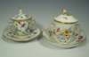 the domed cover with bud finial, the body and saucer decorated in floral sprays; and another similar decorated with floral sprays and insects, both with painted blue crossed sword marks to base (2)