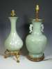 of baluster form with twin handles, butterfly and floral decoration, on a turned wooden base 40cm high (excluding fittings); a similar example of flared baluster form with extensive floral decoration on a three footed gilt metal stand 41cm high (excluding fittings) (2)