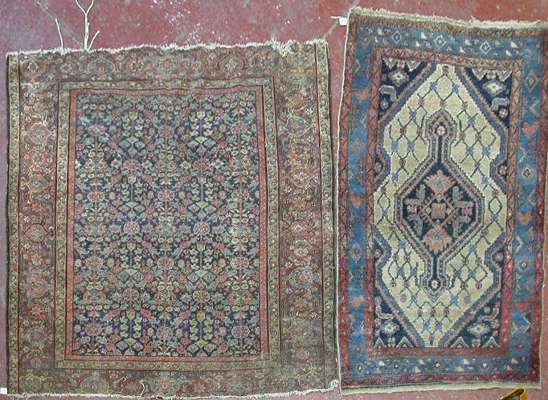 the indigo field with allover herati pattern, within red turtle palmette and vine border between bands, 190cm x 194cm; and a Hamadan rug, the camel field with central indigo medallion, within blue border between bands, 204cm x 122cm (2)