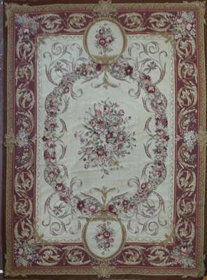 the cream field withcentral floral bouquet and outer floral oval, within brown scrolling acanthus border with floral corners