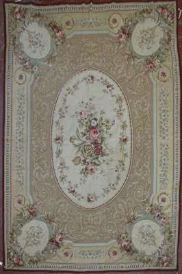 the light brown field with central oval cream medallion with floral bouquet, similar oval spandrels, within cream floral border
