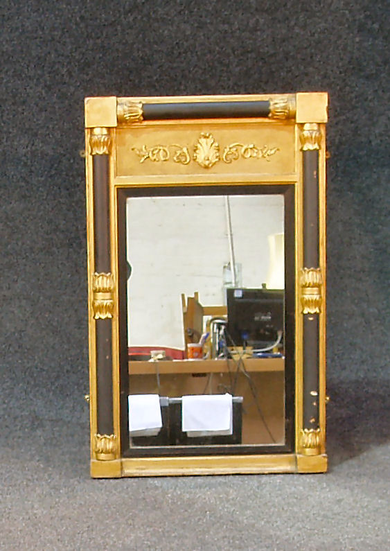 the ebonised pilaster frame topped with acanthus frieze panel with foliate carving, over a moulded ebonised rectangular glass plate