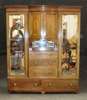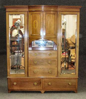 a wardrobe with moulded dentil cornice over two inlaid cupboard doors, three short drawers flanked by mirrored doors, over two long drawers on bracket feet, 170cm wide 206cm high; a dressing table, 108cm wide, 77cm high; a bedside cabinet, 44 cm wide 77cm high; and a bowfront swing mirrord dressing table, 106cm wide, 148cm high (4)
