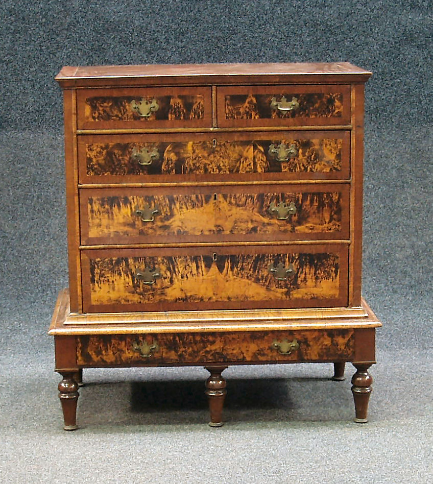 the moulded cornice above two short and three graduated long drawers, the moulded stepped base with single frieze drawer, on squat tapering turned legs