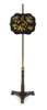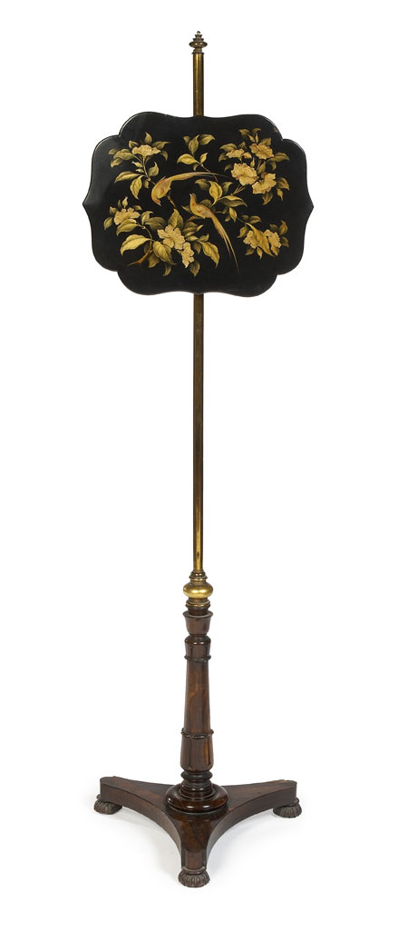 the cartouche-shaped papier mache banner painted with ho-ho birds on a flowering branch above a brass column and lappet-carved pillar, on triform plinth with gadrooned bun feet