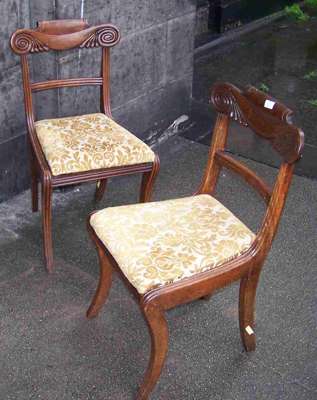 the stepped top rail over a single splat, the drop-in seat on reeded sabre legs and two similar chairs (7)