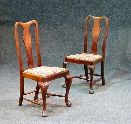 each with serpentine top-rail over a fiddle back splat, drop-in seat on cabriole legs, pad feet, united by stretchers (6)