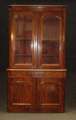 the moulded cornice over two arched glazed doors enclosing adjustable shelves, on stepped cabinet with panelled doors, plinth base