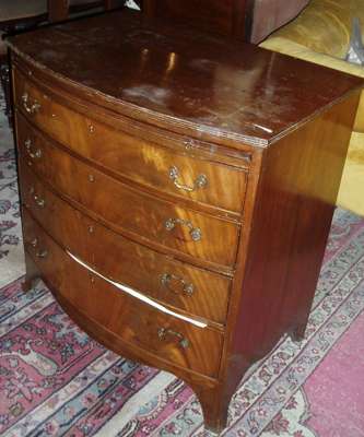 the moulded top over brushing slide, four graduated long drawers, serpentine apron, splayed bracket feet