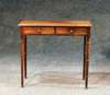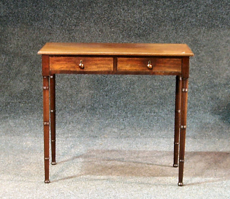 the moulded rectangular top over two frieze drawers on ring turned tapering legs