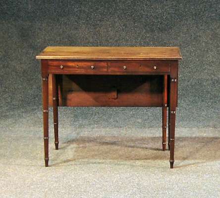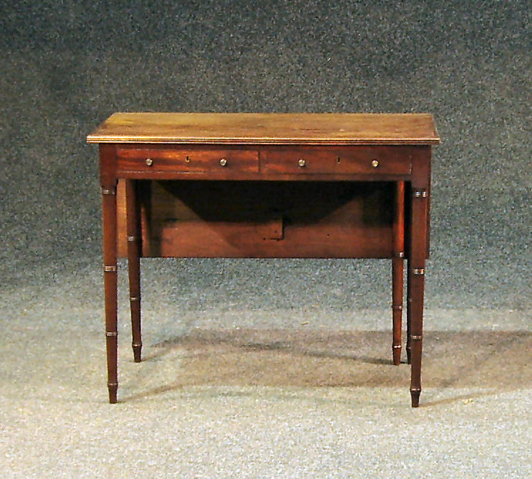 the moulded rectangular top over two frieze drawers, on ring turned tapering legs