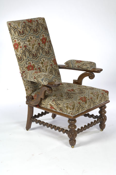 in the 'Gothic' taste, upholstered in floral gros point, the rectangular back above padded arms on re-entrant acanthus carved supports, the stuffover seat on turned legs united by barley twist stretchers on castors