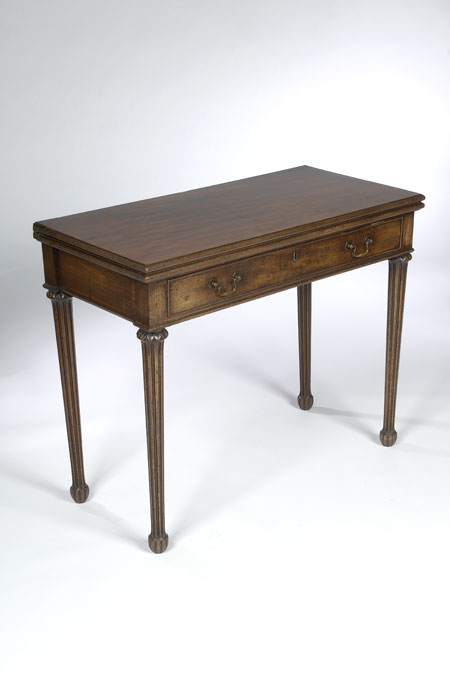 the fold over top with inset baize and moulded edge above single drawer with swan neck handles, on turned, and foliate-carved and fluted tapering legs