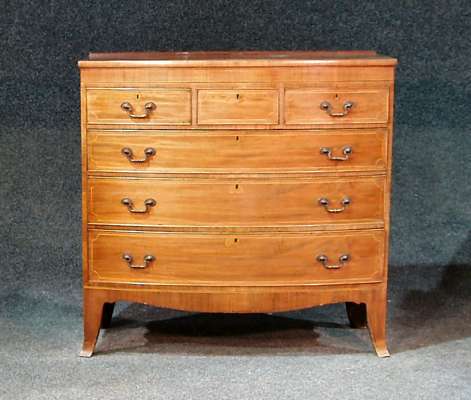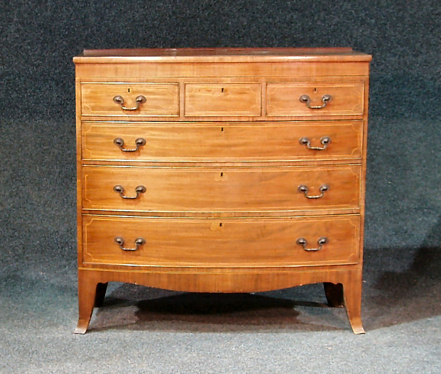 the boxwood and ebony strung frieze over three short and three long cock beaded graduated drawers, serpentine apron, splayed bracket feet