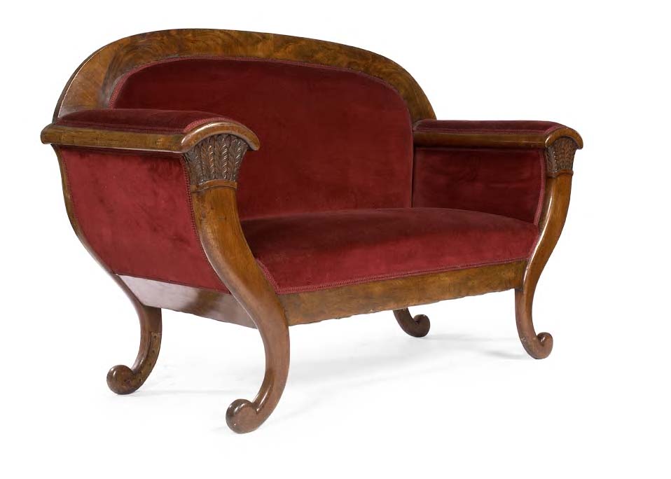 in the Biedermier taste, the broad arched top rail above stiff leaf carved lyre-end arms, on out-scrolling legs