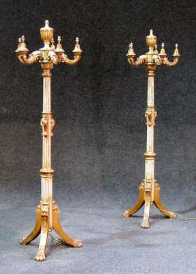 each topped with urn finial over five foliate carved branches, on fluted tapering turned column, tripod legs with hairy paw feet (2)