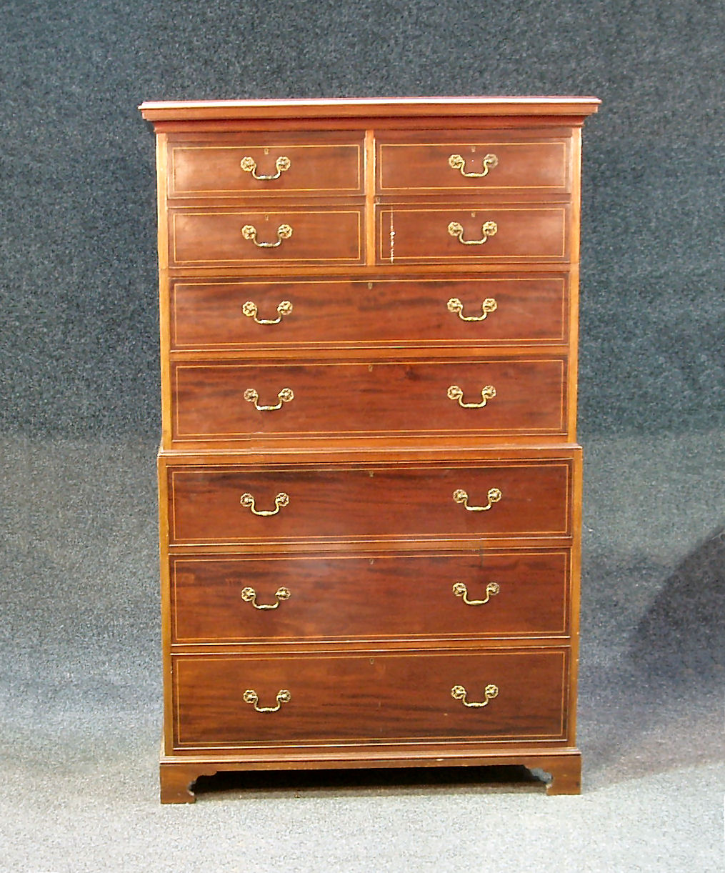the moulded cornice over four boxwood strung and cock beaded short dummy drawers enclosing slides, over five graduated long drawers, on bracket feet