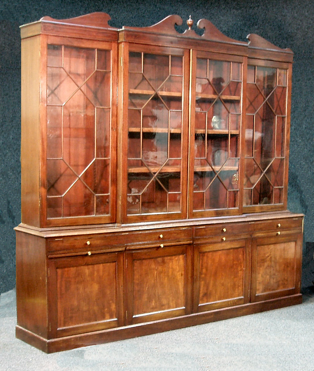 the swan-neck pediment with central urn finial, over boxwood strung frieze, four astragal glazed doors, enclosing adjustable shelves, on a moulded rectangular lower section, comprising two long drawers, four slides over four panelled cupboards, on plinth base
