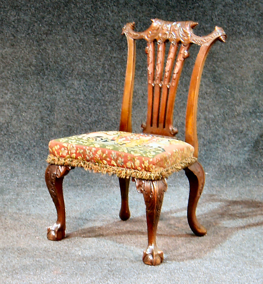 the foliate carved top rail over swag carved vertical splats, embroidered seat, on acanthus carved cabriole legs, claw and ball feet