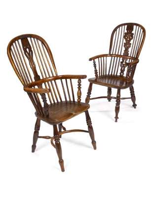 each with tall curved backs and scrolling arms, spindle filled and with scrolled cut-out splat above a moulded solid seat on baluster and ring turned legs linked by hoop stretchers (2)