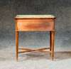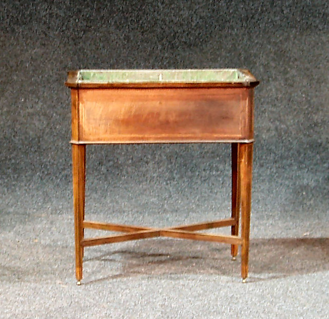 the banded rectangular top with canted corners over boxwood and ebony stringing frieze, on square tapering legs, united by stretchers, brass ball feet