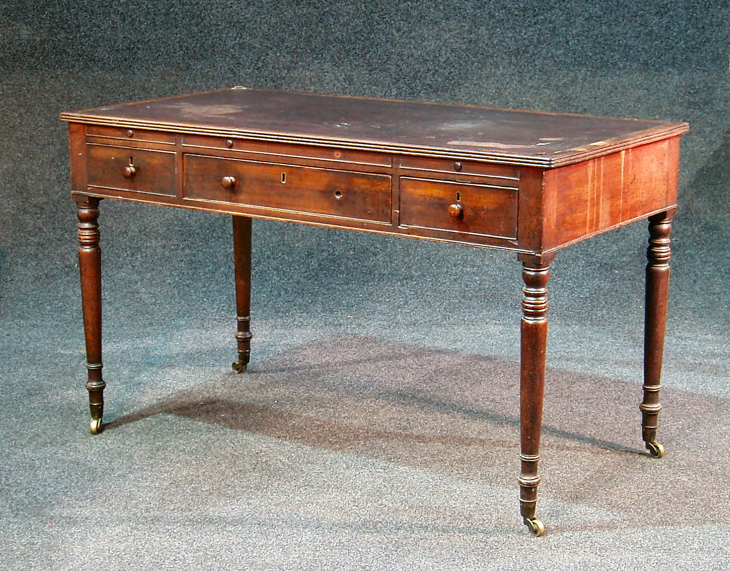 the moulded rectangular top with skiver, over a single long frieze drawer flanked by two short and opposing dummy drawers, on baluster turned legs, brass caps and castors