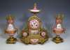 By P H Mourey, the dial with roman numerals and a putti, above a main panel depicting a scene of lovers in woods, the garnitures with floral sprays and birds, all on a pink ground (3)
