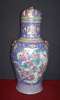 of baluster form, with twin gilt lion head handles, decorated allover with polychrome floral and scrolling foliate decoration on a deep blue ground, interspersed by opposed figural panels to the cover, neck and body (damages)