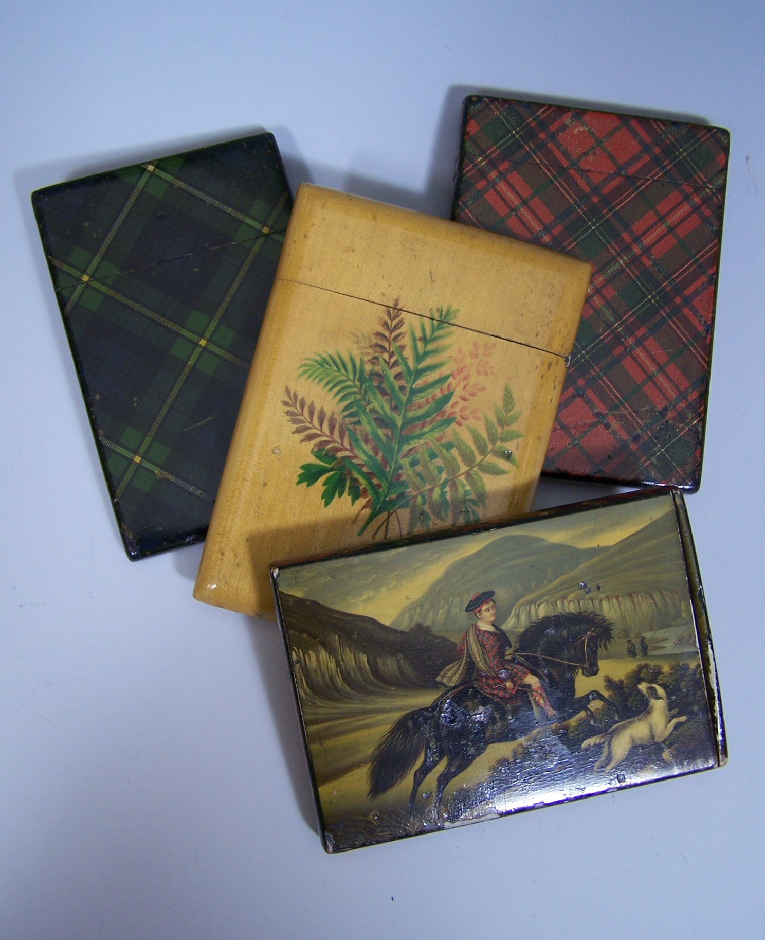 with scene of a Highlander on horseback, the opposing sides covered in tartan; two other tartanware examples and another wooden example (4)